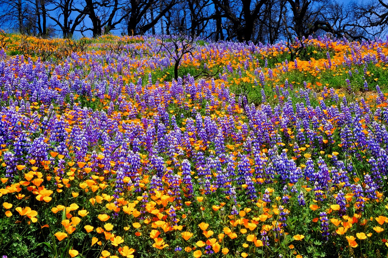 Annual wildflowers such as sky lupine and tufted poppy (Lupinus nanus, Eschscholzia caespitosa) put on great displays in the burn zone on Figueroa last spring, and we may be lucky enough to see a similar profusion of blooms this year. Photo by John Evarts.